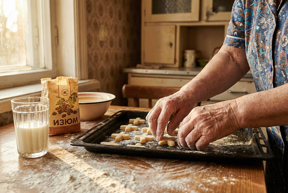 Бабушка выкладывает печенье в форме крестиков на противень на советской кухне