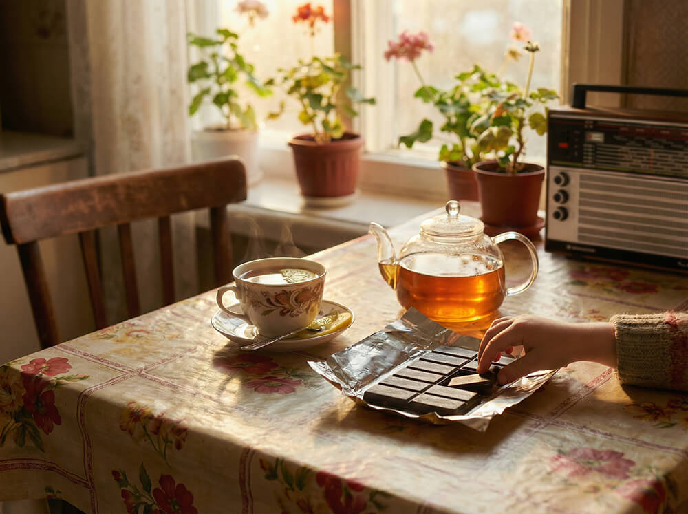 Для детей тот самый тёмный шоколад часто становился испытанием. Мы привыкли к сладости ирисок, поэтому первый кусочек благородной плитки казался слишком горьким, «взрослым». Но был в этом особый шик: если тебе дают кусочек тёмного шоколада перед экзаменом «для ума» или во время болезни – значит, тебя воспринимают всерьёз. Это был символ взросления, когда ты начинал понимать, что вкус может быть сложным, а удовольствие – не только в сахаре.