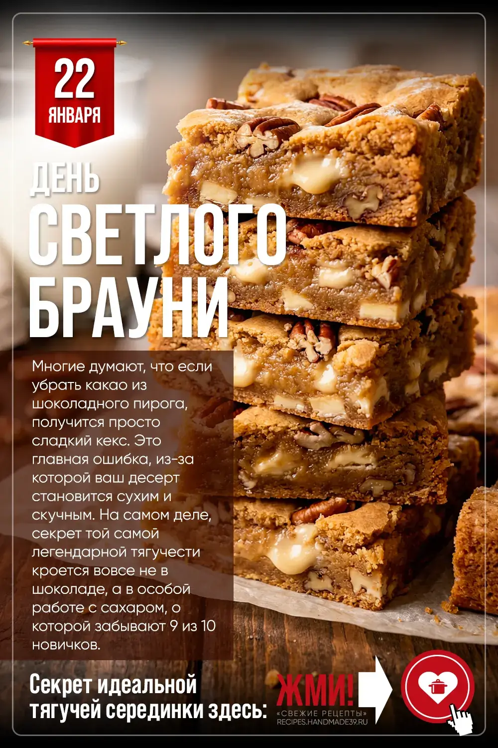 День светлого брауни (National Blonde Brownie Day) традиционно отмечают 22 января. Хотя сегодня шоколадная версия этого десерта кажется нам каноничной, история расставляет всё по своим местам. «Блонди» – это не просто брауни без какао, это его исторический предок. В кулинарных книгах конца XIX века, например, у знаменитой Фанни Фармер, рецепты пирожных на основе мелассы и масла появились задолго до того, как шоколад стал доступным ингредиентом для массовой выпечки. Так что, откусывая кусочек золотистого десерта, вы, по сути, пробуете вкус эпохи газовых фонарей и конных экипажей.