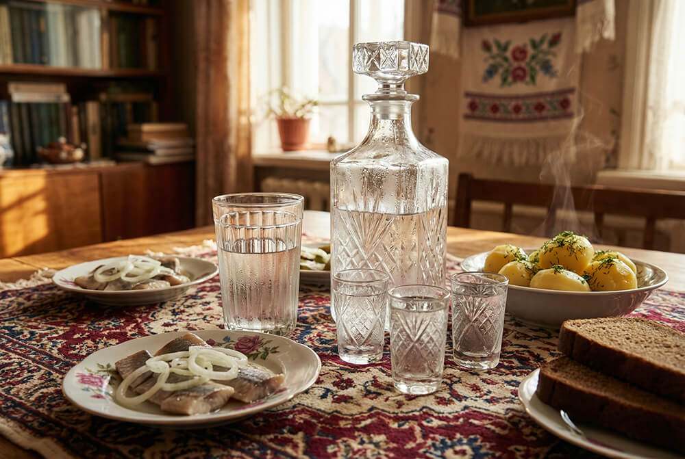 Однако в более торжественных случаях на крахмальные скатерти выставлялся тяжёлый фамильный хрусталь и запотевшие графины, извлечённые из морозильной камеры за мгновение до первого тоста. Рядом неизменно располагались атрибуты классического застолья: мельхиоровые вилки, фарфоровые селёдочницы и миниатюрные розетки с горчицей. Культура пития требовала неспешности и обязательного гастрономического сопровождения, превращая процесс в ритуал общения, а не простого употребления алкоголя.