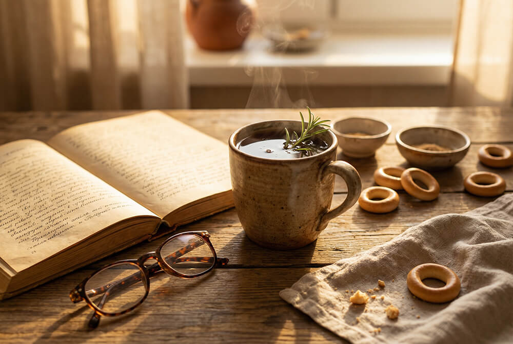 Татьянин день. Атмосферное фото в стиле ретро: кружка сбитня на столе с конспектами и очками