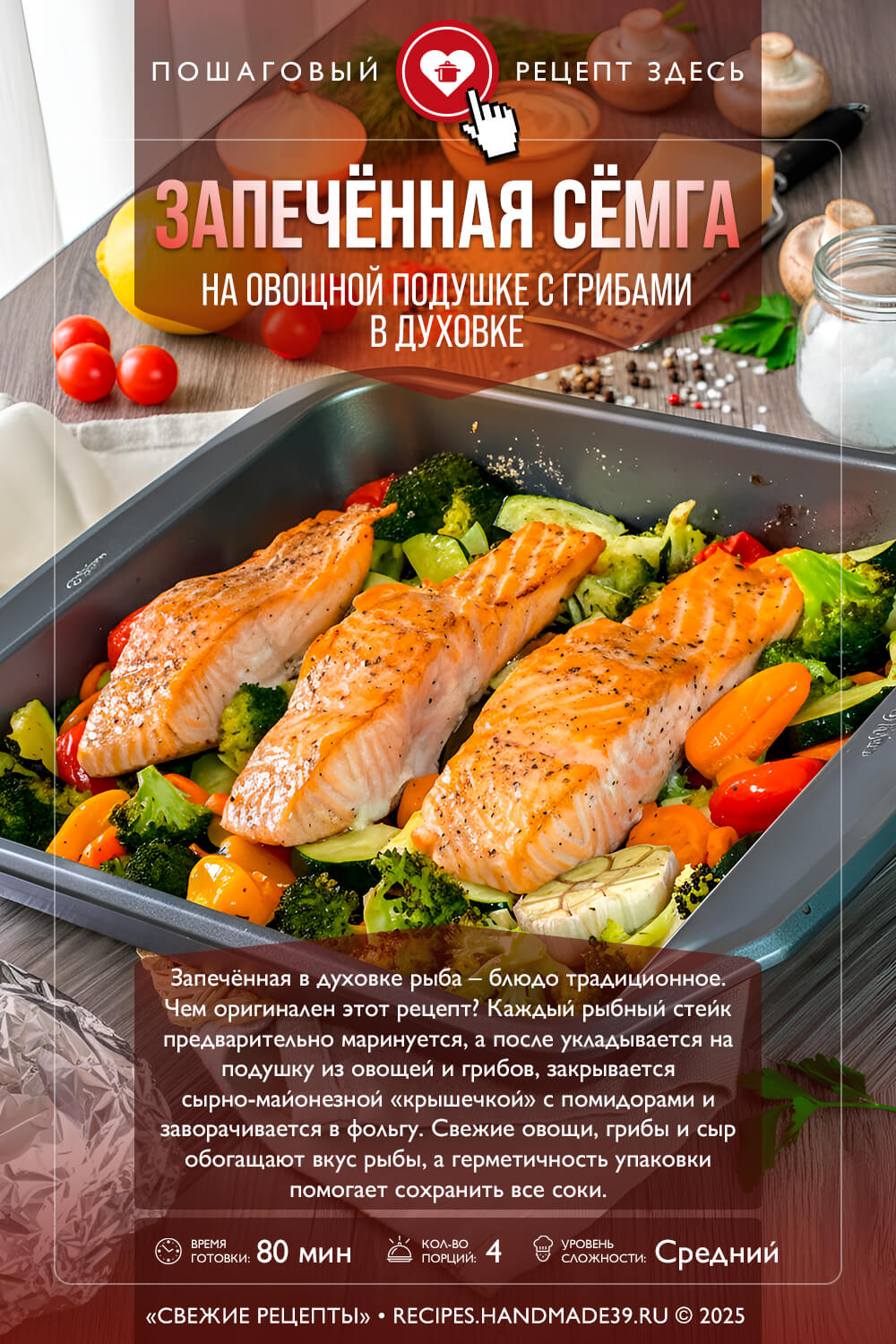 Я обожаю сёмгу, а такая подача ещё больше привлекает внимание! Было удивительно вкусно и сытно — рыба нежная, сочная, сочетается со сладостью овощей и изысканным вкусом грибов. К тому же, оформление блюда было просто великолепным, как из фантастического ресторана. Рекомендую всем попробовать эту вкусную и оригинальную комбинацию — это станет настоящим украшением любого стола!