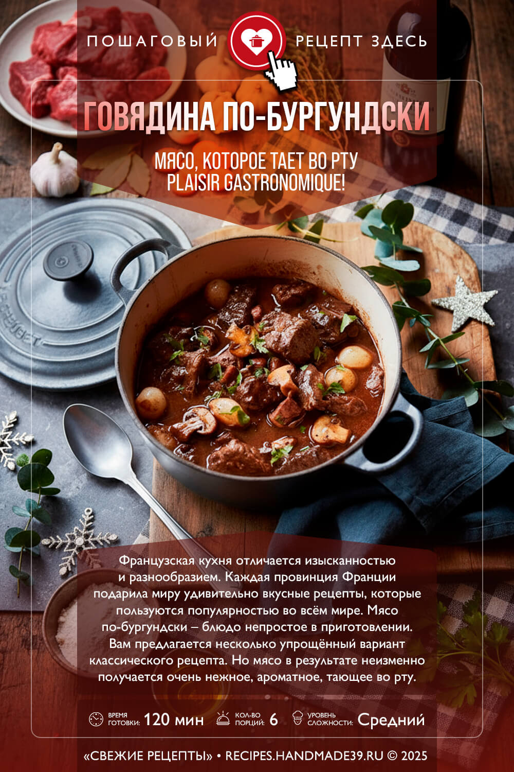 Сказочно вкусный букет ароматов: лавровый лист, петрушка, тимьян, красное вино, чеснок, лук, морковь и нежная говядина. Бургундия! Франция! Plaisir gastronomique!