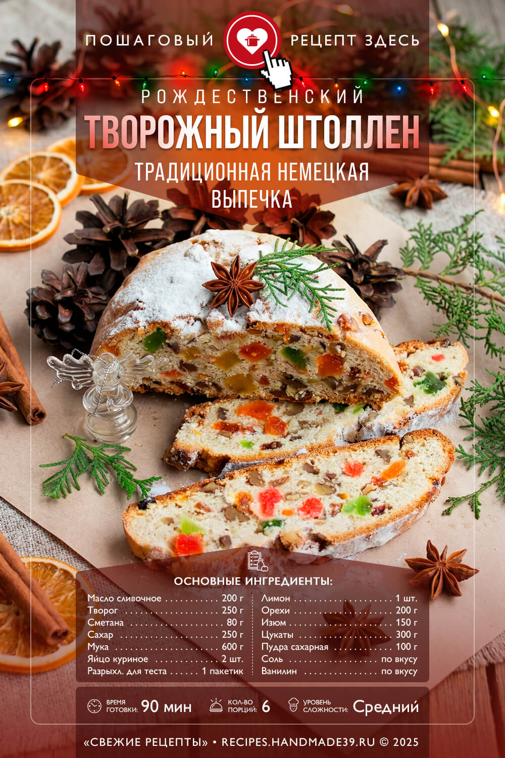 Много-много цукатов, орехов, изюма и творожное тесто – это настоящий рождественский штоллен. Праздник на пороге!
