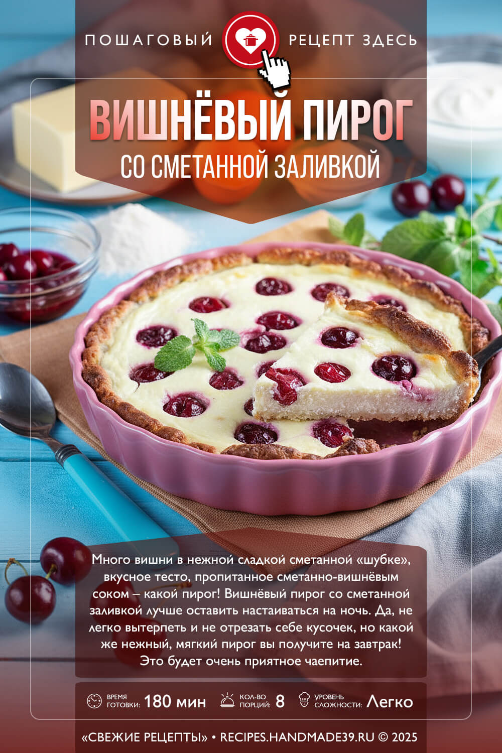 Много вишни в нежной сладкой сметанной «шубке», вкусное тесто, пропитанное сметанно-вишнёвым соком – какой пирог!