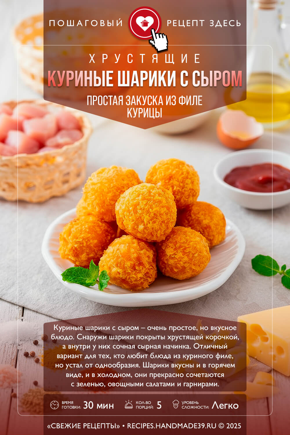 Аппетитная хрустящая корочка, под ней сочное куриный фарш, а в серединке – сы-ы-ыр! Очень соблазнительные куриные шарики!