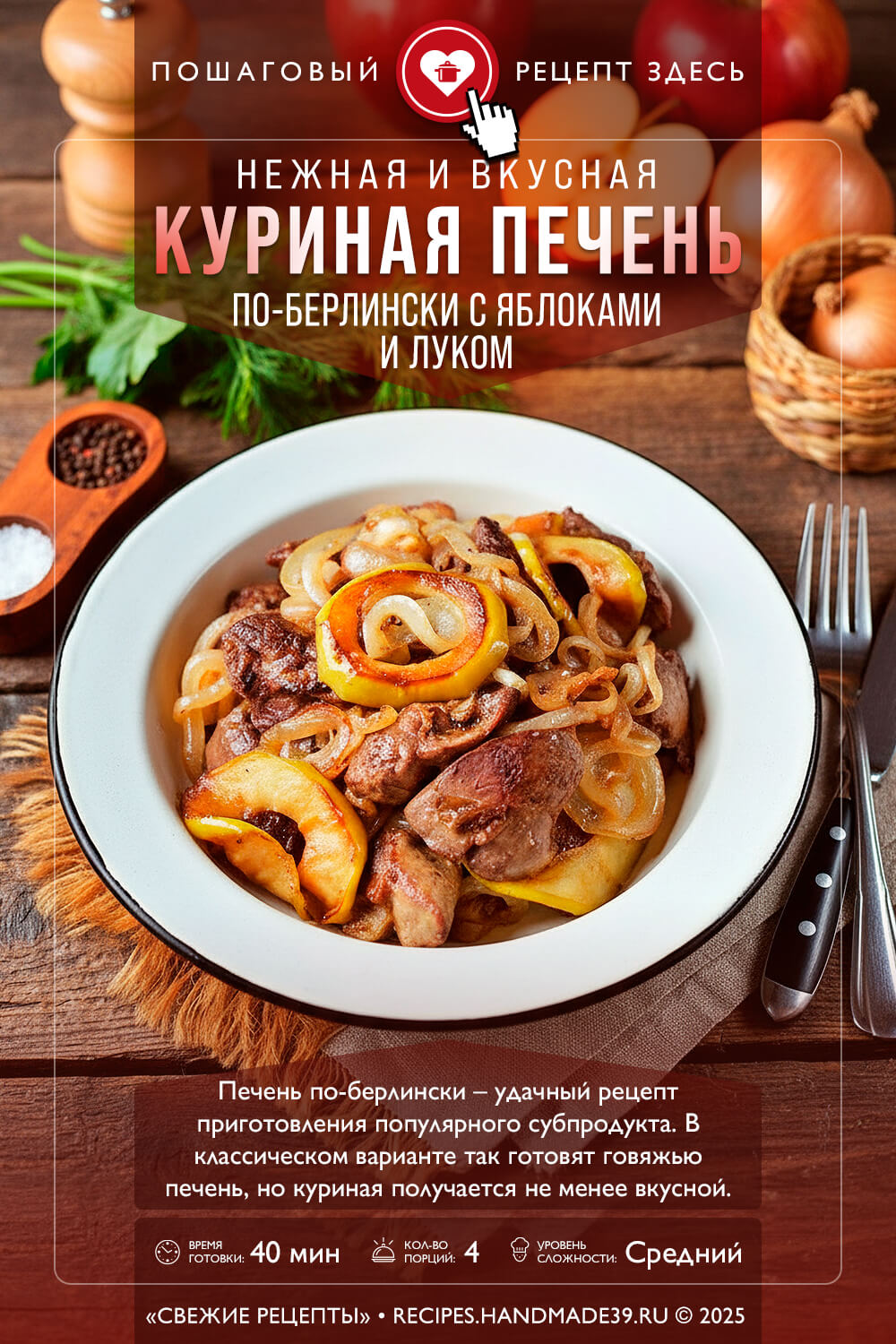 Печень по-берлински – удачный рецепт приготовления популярного субпродукта. В классическом варианте так готовят говяжью печень, но куриная получается не менее вкусной. Яблоко даёт блюду дополнительную мягкость и сочность. Обжаренный лук – традиционный спутник мяса. Важны специи: корица, мускатный орех, молотый чёрный перец. Не забудьте сбрызнуть нарезанные яблоки лимонным соком, чтобы дольки не потемнели.