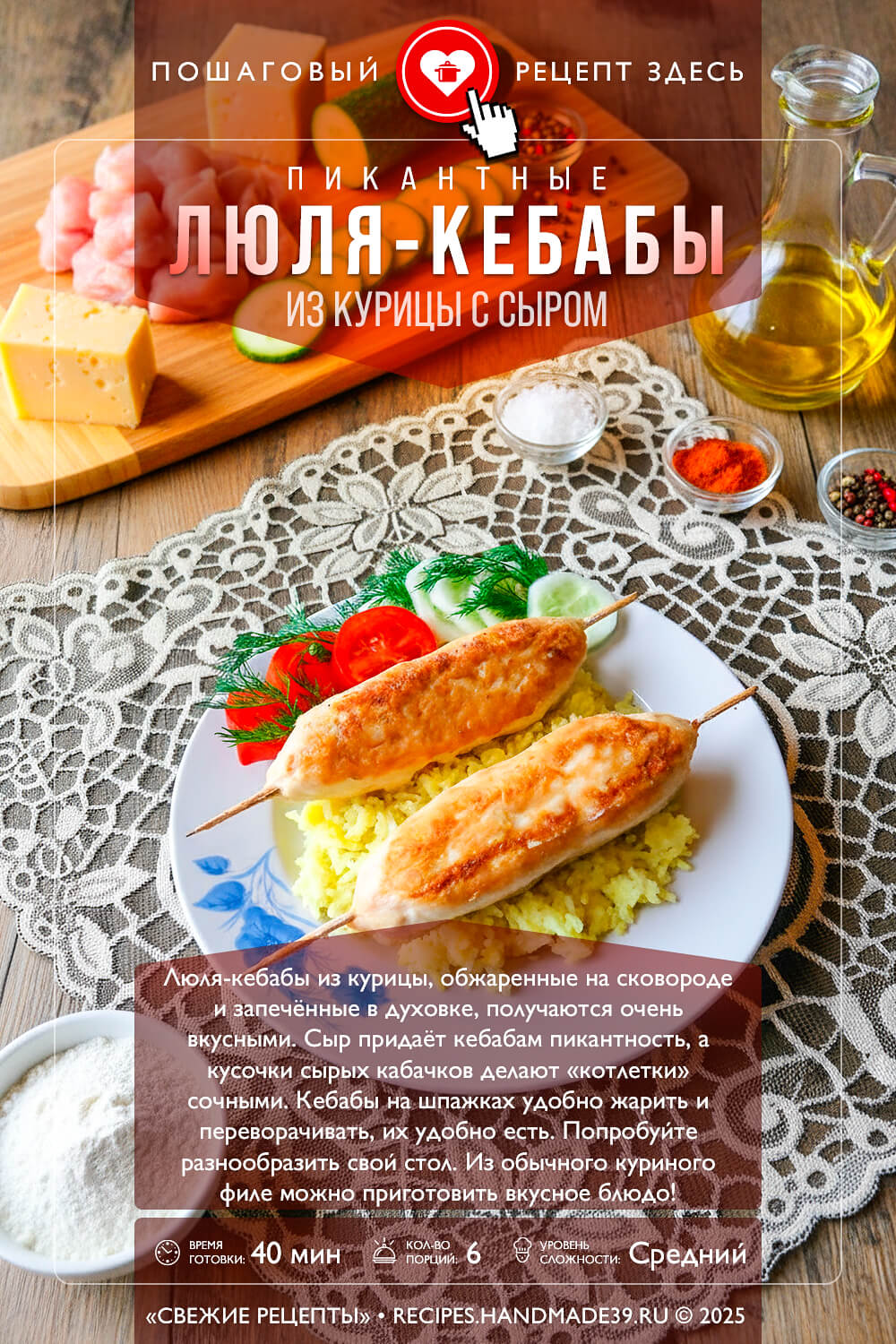 Но, поверьте, люля-кебабы из курицы, обжаренные на сковороде и запечённые в духовке, получаются тоже очень вкусными. Сыр придаёт кебабам пикантность, а кусочки сырых кабачков делают «котлетки» сочными. Кебабы на шпажках удобно жарить и переворачивать, их удобно есть.