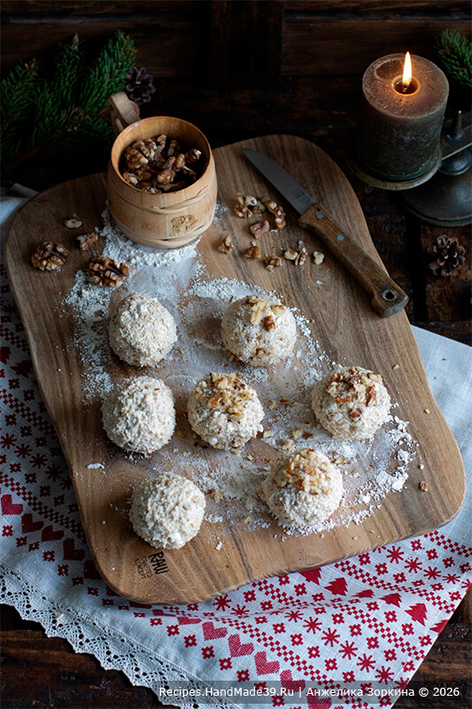 Добавить 50 г измельчённых орехов, перемешать лопаткой. Тесто получается немного липкое (особенно, если использовать cottage cheese или очень влажный творог). Забивать мукой тесто не стоит. |