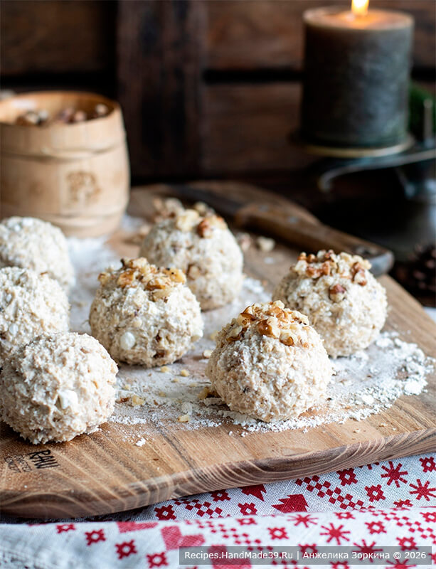 Добавить 50 г измельчённых орехов, перемешать лопаткой. Тесто получается немного липкое (особенно, если использовать cottage cheese или очень влажный творог). Забивать мукой тесто не стоит. |