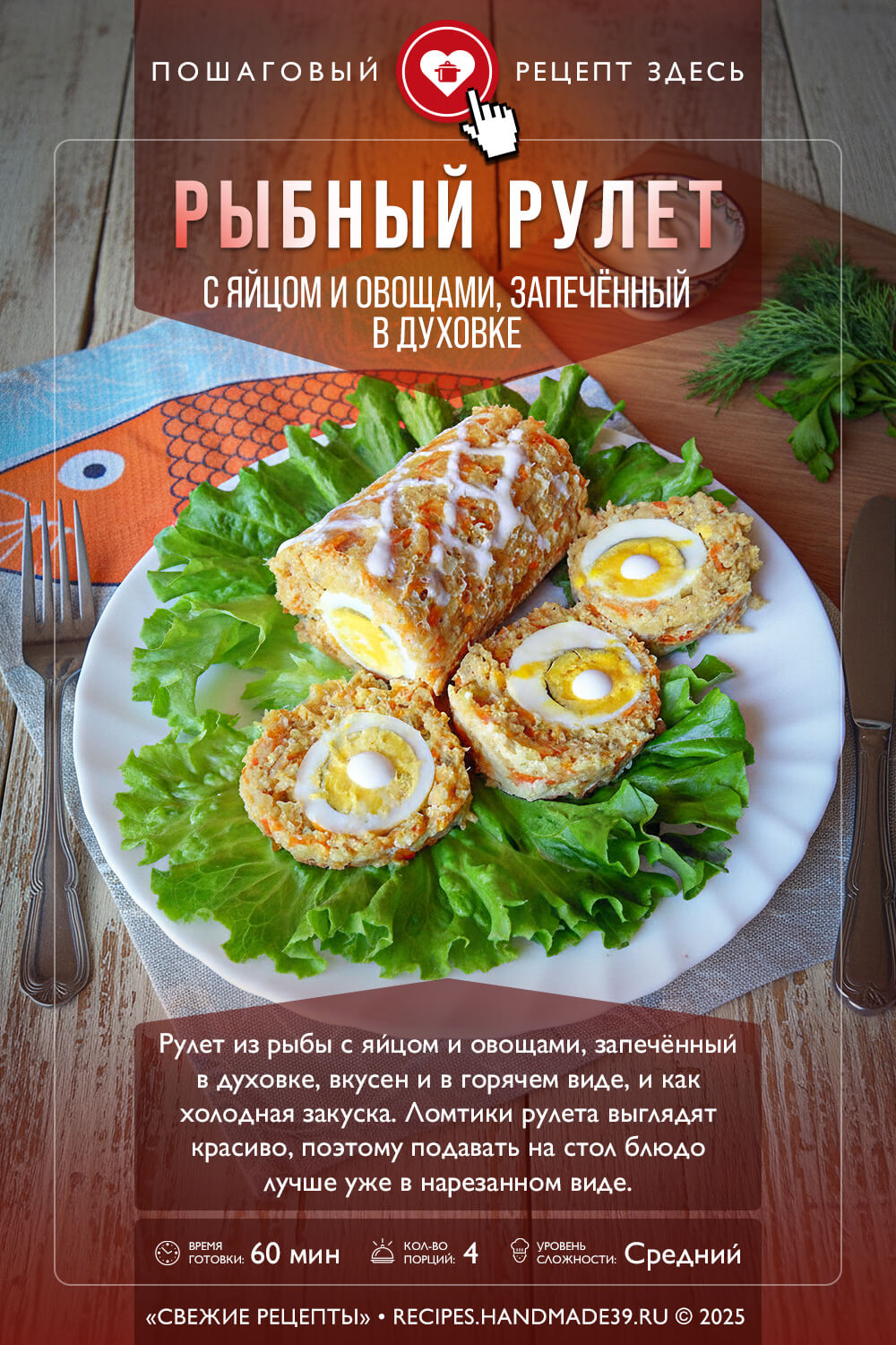Яйцо в рыбно-овощной «шубке» похоже на солнышко. Красиво, вкусно, полезно. Рыбный рулет – это здорово!