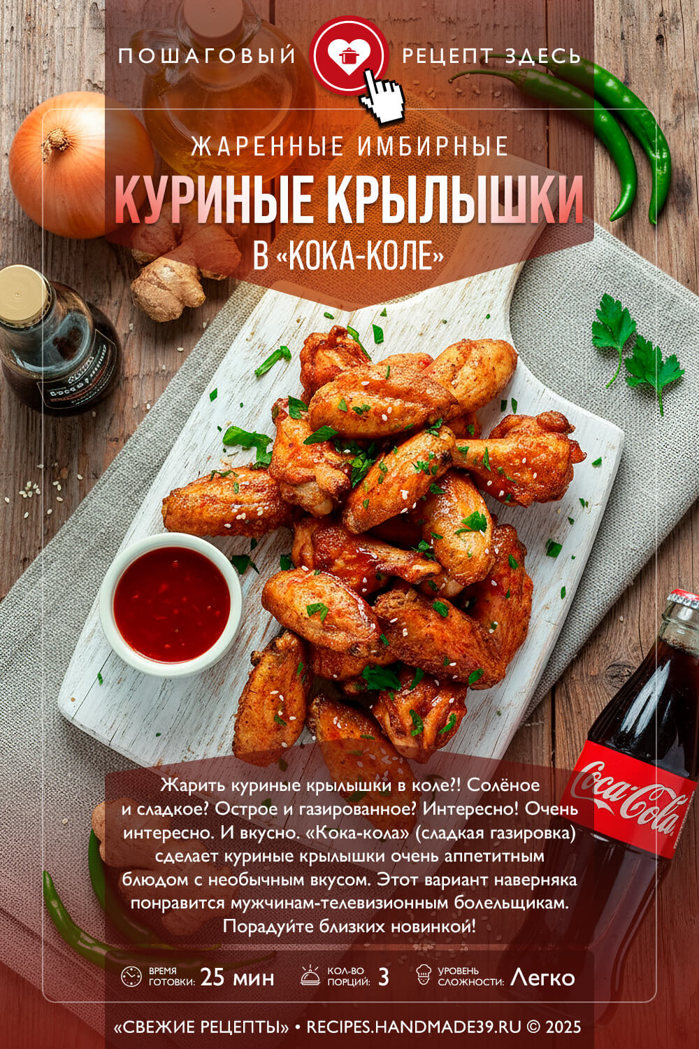 «Кока-кола» – сладкая газировка – сделает куриные крылышки очень аппетитным блюдом с необычным вкусом. Этот вариант наверняка понравится мужчинам-телевизионным болельщикам. Порадуйте близких новинкой!
