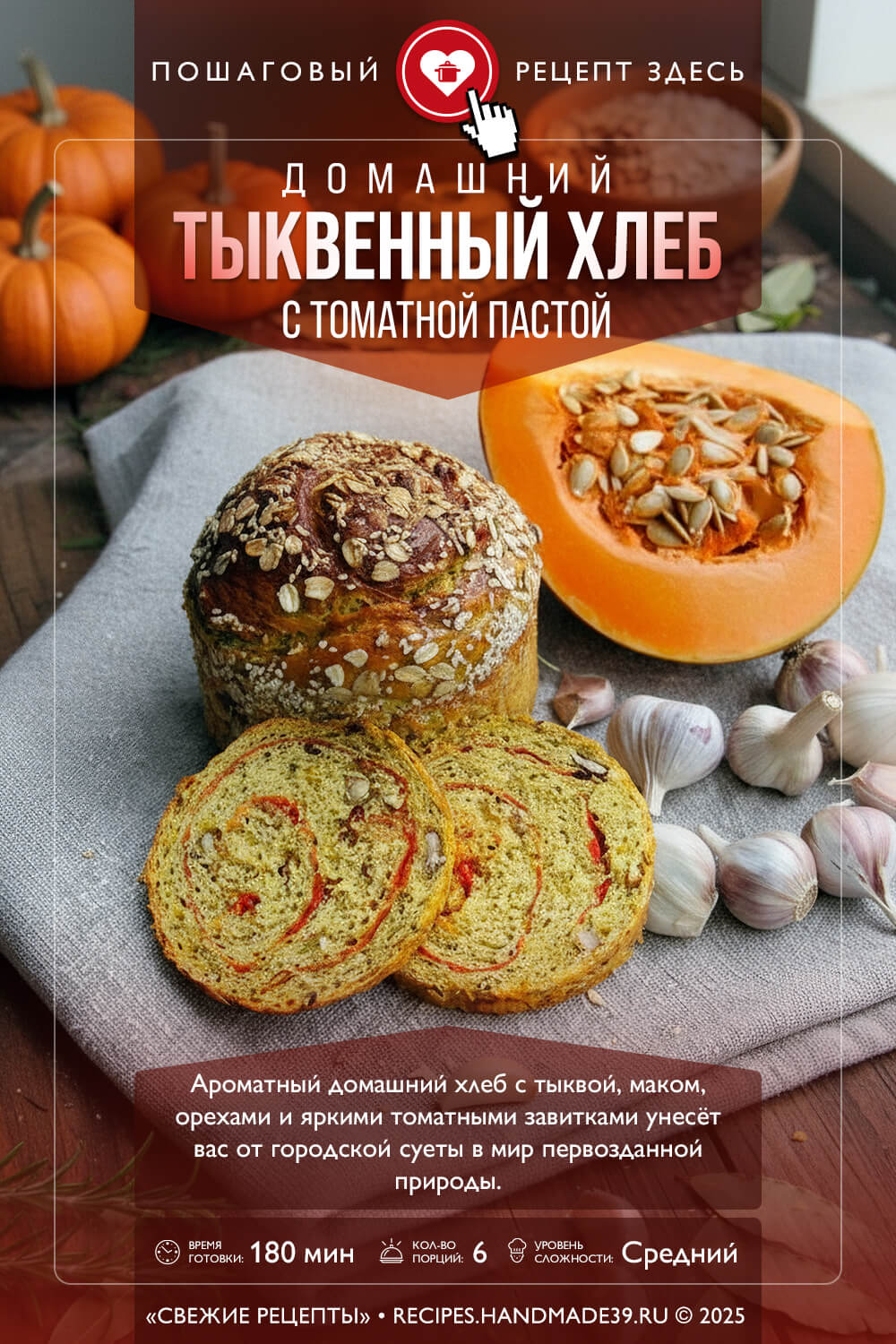 Ароматный домашний хлеб с тыквой, маком, орехами и яркими томатными завитками унесёт вас от городской суеты в мир первозданной природы.