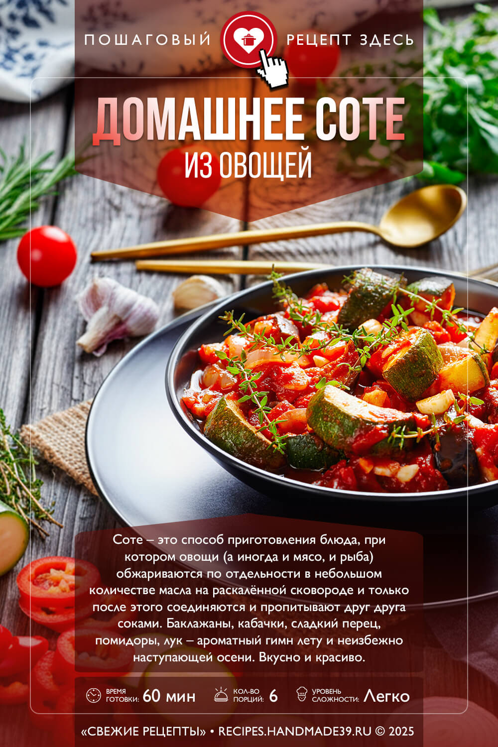 Современные хозяйки не всегда заставляют ингредиенты «подпрыгивать» на сковороде, отходя от классического способа приготовления. Поэтому «соте» сегодня часто похоже на овощное рагу. Что ж… Кулинария – это живой организм, который может развиваться.