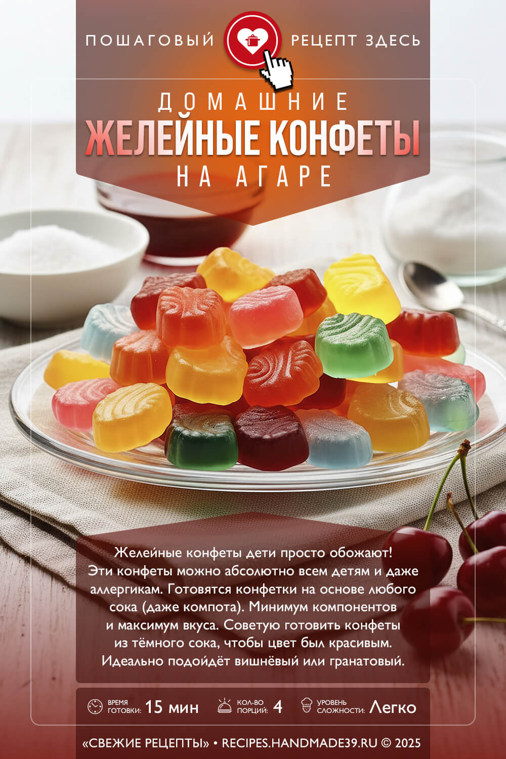 Желейные конфеты дети просто обожают! Я уже писала ранее рецепты вкусных сладостей для детей. Теперь ход дошел и до желешек. Эти конфеты можно абсолютно всем детям и даже аллергикам. Только я заменила желатин агар-агаром (хорошая находка для тех, кто не любит привкус желатина и хочет добиться более плотной консистенции).