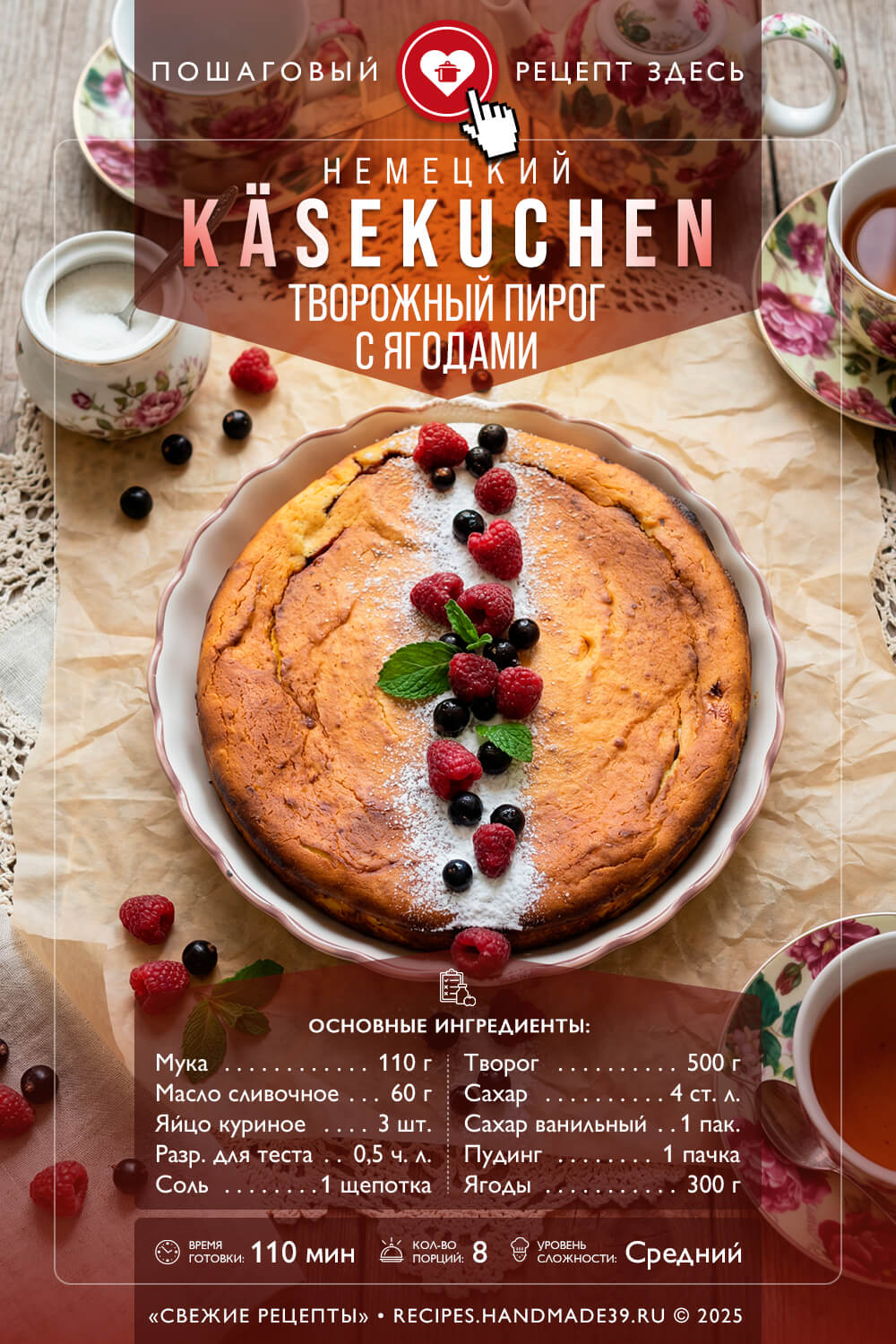 Кезекухен – пирог из песочного теста с нежной творожной начинкой. Ягодная прослойка делает вкус ярким и незабываемым.