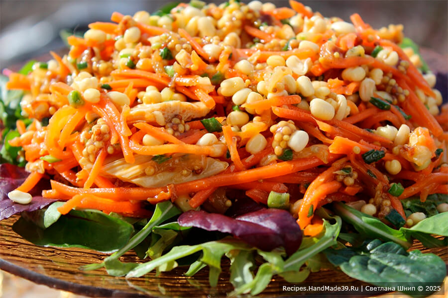 Дерзкая острота корейской моркови, сдержанная сытность маша, немного зелени и специй – вот рецепт салата, который порадует вкусом и красотой.