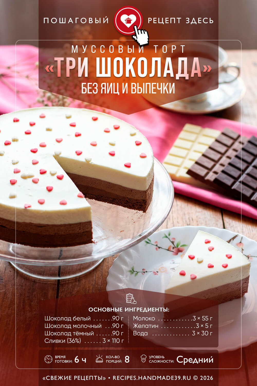 Муссовый торт «Три шоколада» – воздушный десерт из трёх видов сливочного мусса с тёмным, молочным и белым шоколадом. Вкус просто изумительный! Он достигается благодаря гармоничному сочетанию разных шоколадных слоёв и нежной текстуре десерта. Мусс готовится без использования яиц.