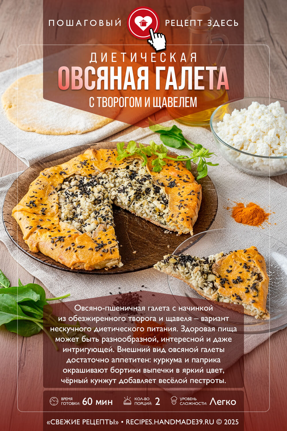 Овсяно-пшеничная галета с начинкой из обезжиренного творога и щавеля – вариант нескучного диетического питания. Здоровая пища может быть разнообразной, интересной и даже интригующей. Внешний вид овсяной галеты достаточно аппетитен: куркума и паприка окрашивают бортики выпечки в яркий цвет, чёрный кунжут добавляет весёлой пестроты.