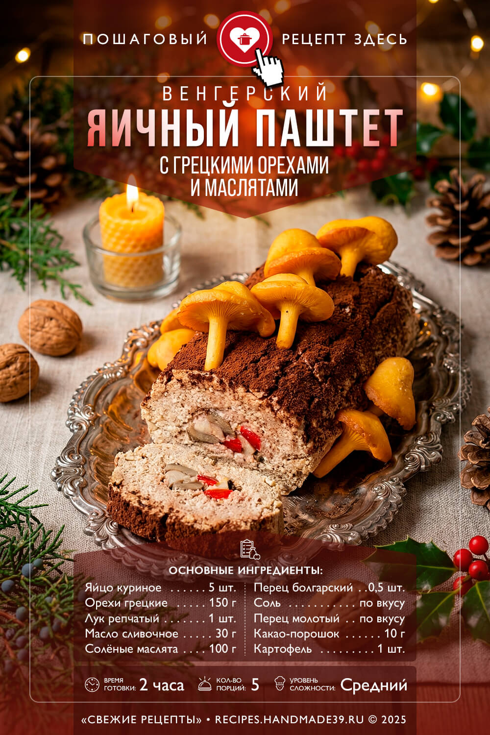 Венгерский яичный паштет с грецкими орехами и маслятами можно смело делать частью шоу-программы за праздничным столом. Предложите назвать ингредиенты блюда. Пусть гости угадают страну, которая подарила нам такой необычный рецепт. Наконец, можно устроить конкурс на лучшее название для паштета из яиц, грецких орехов, солёных маслят и какао!