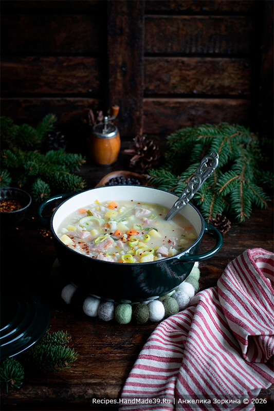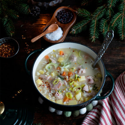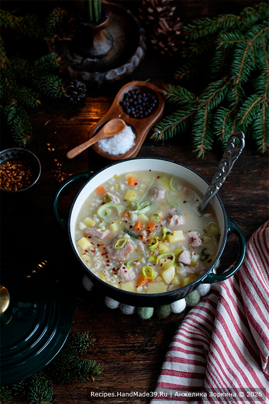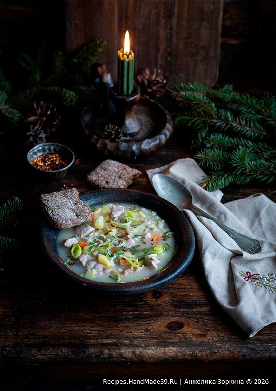 Густой суп с перловкой и грудинкой согреет долгой зимой. Представьте: скандинавские морозы не отступают, фьорд скован льдом. И хоть солнце появляется всё чаще и день длится дольше – в воздухе ни намека на весну.