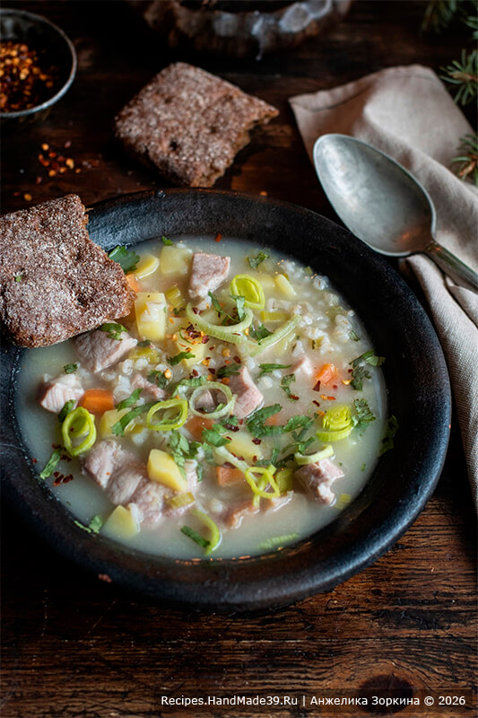 Густой суп с перловкой и грудинкой согреет долгой зимой. Представьте: скандинавские морозы не отступают, фьорд скован льдом. И хоть солнце появляется всё чаще и день длится дольше – в воздухе ни намека на весну.