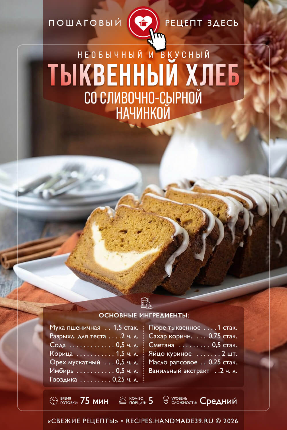 Насыщенный аромат хлеба очень интересно сочетается с сладкой начинкой из сливочного сыра. Можно сказать, что это почти тыквенный чизкейк в хлебном варианте, только приготовить его намного проще.