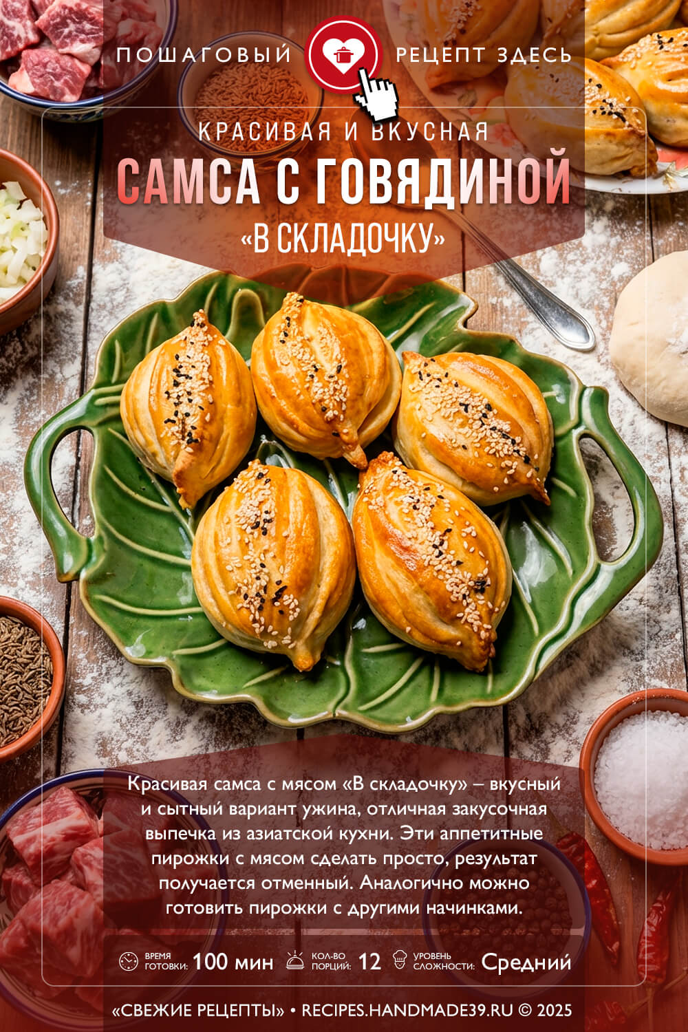 Красивая самса с мясом «В складочку» – вкусный и сытный вариант ужина, отличная закусочная выпечка из азиатской кухни. Эти аппетитные пирожки с мясом сделать просто, результат получается отменный. Аналогично можно готовить пирожки с другими начинками.