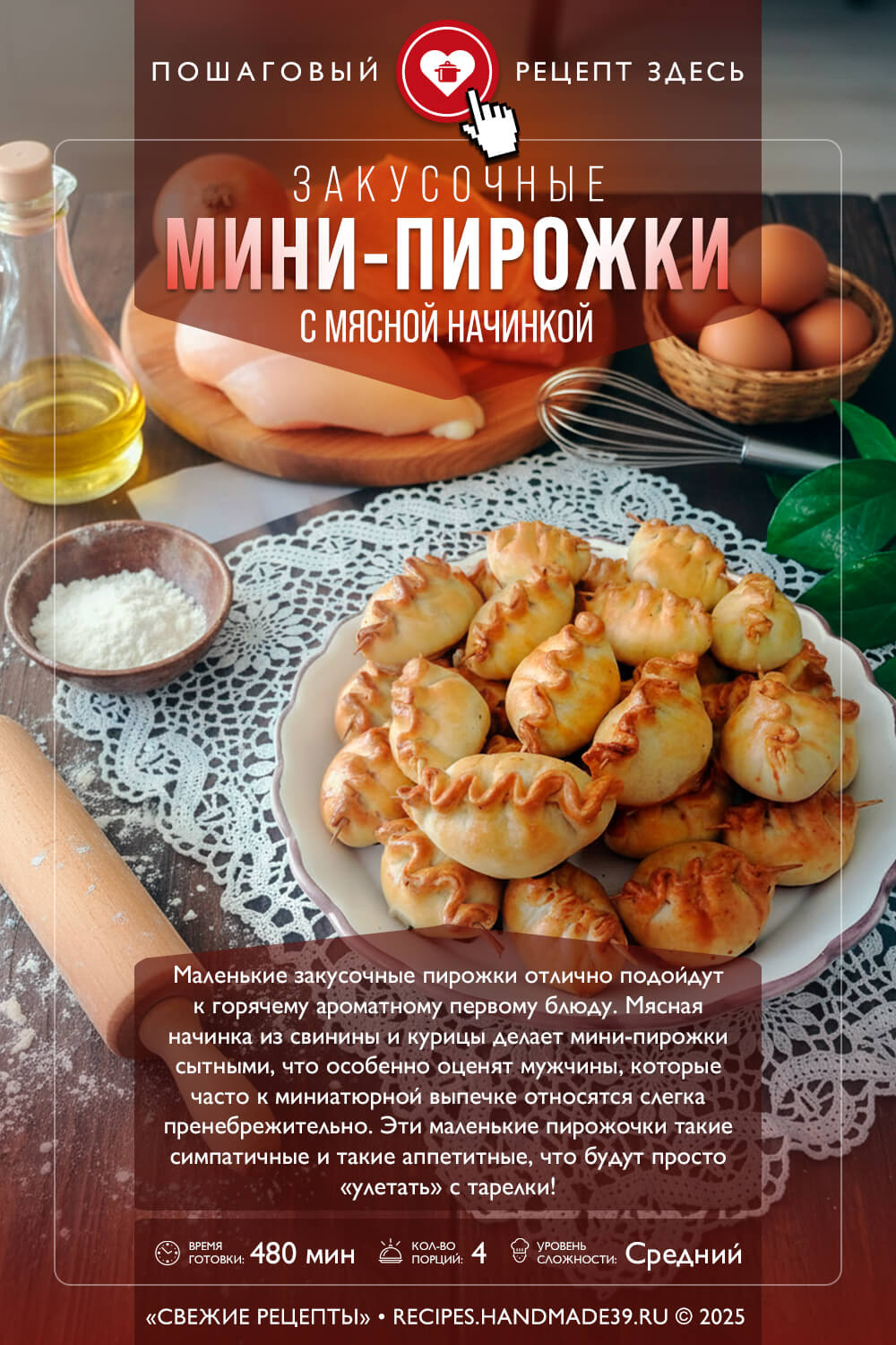 Маленькие закусочные пирожки отлично подойдут к горячему ароматному первому блюду. Мясная начинка из свинины и курицы делает мини-пирожки сытными, что особенно оценят мужчины, которые часто к миниатюрной выпечке относятся слегка пренебрежительно.