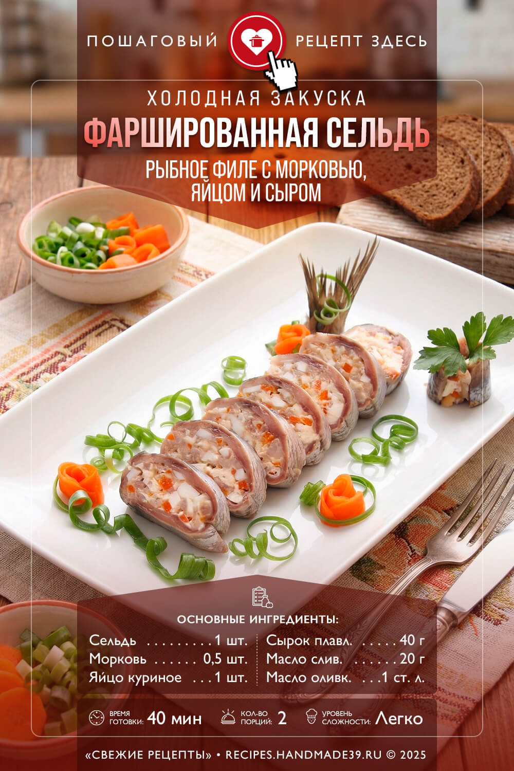 Нежнейшая селёдочка с начинкой из яиц, моркови и плавленых сырков – прекрасный вариант холодной закуски. Тонкий сливочный вкус особенно понравится дамам.