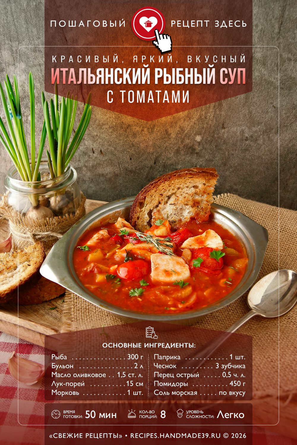 Томатный рыбный суп по-итальянски в классическом варианте включает несколько видов рыбы, мидии, креветки. Сегодня приготовим более простой, «скромный» вариант. Суп получается очень красивый, яркий, вкусный, с богатым ароматом.