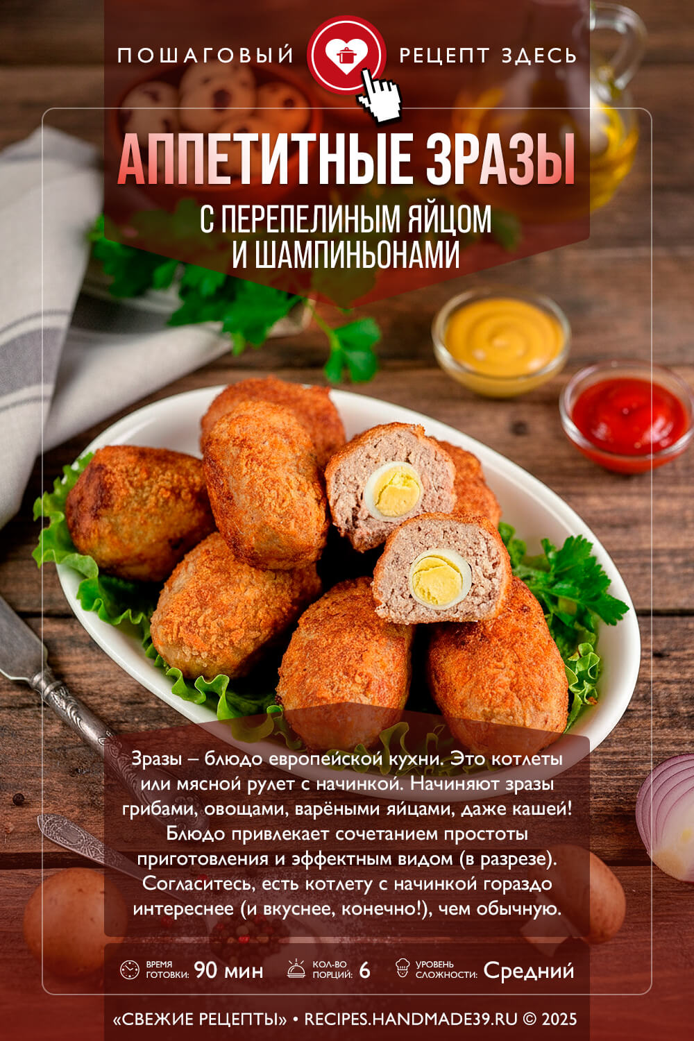 Аппетитные зразы, запечённые в духовке. А что внутри? Есть перепелиные яйца, есть шампиньоны – сюрприз! Вкусный сюрприз.